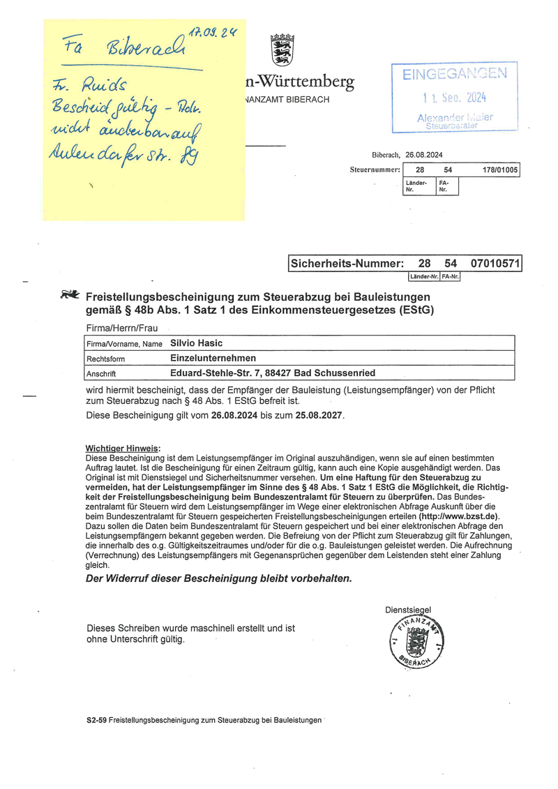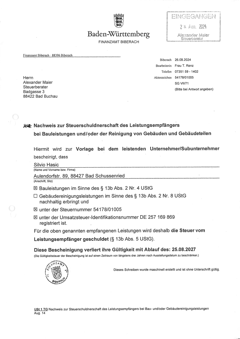 Nachweis zur Steuerschuldnerschaft
